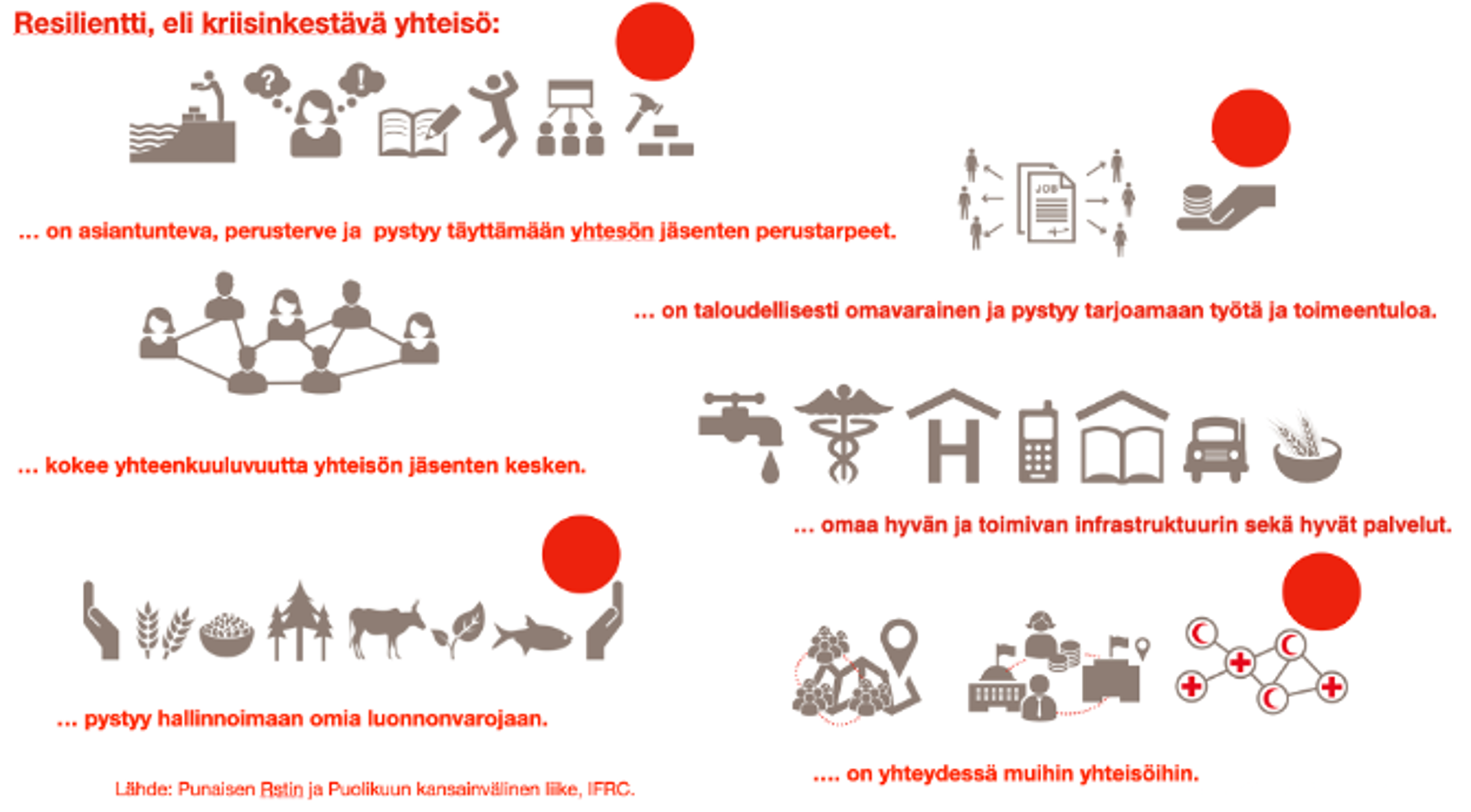 Kansainvälisen Punaisen Ristin ja Puolikuun auttamistoiminta perustuu hyvin pitkälle paikallisten yhteisöjen vahvistamiseen. Yhteisöjen resilienssiä tarvitaan, jotta yhteiskuntajärjestelmät ja lähiyhteisöt pystyvät sopeutumaan erilaisiin muutoksiin. Yhteisöjen ja yksilöiden resilienssiä tarvitaan, jotta onnettomuuksien, häiriöiden, kriisien ja katastrofien vaikutukset ovat mahdollisimman vähäisiä ja jotta ihmiset pystyvät selviytymään niistä mahdollisimman pienin vammoin. Jokainen ihminen tarvitsee resilienssiä. Mutta aina yksittäisellä ihmisellä ole voimavaroja, jolloin tarvitaan toisia ihmisiä, yhteisöjä ja niiden rakenteita. Silloin yhteisön resilienssillä on suuri merkitys.
