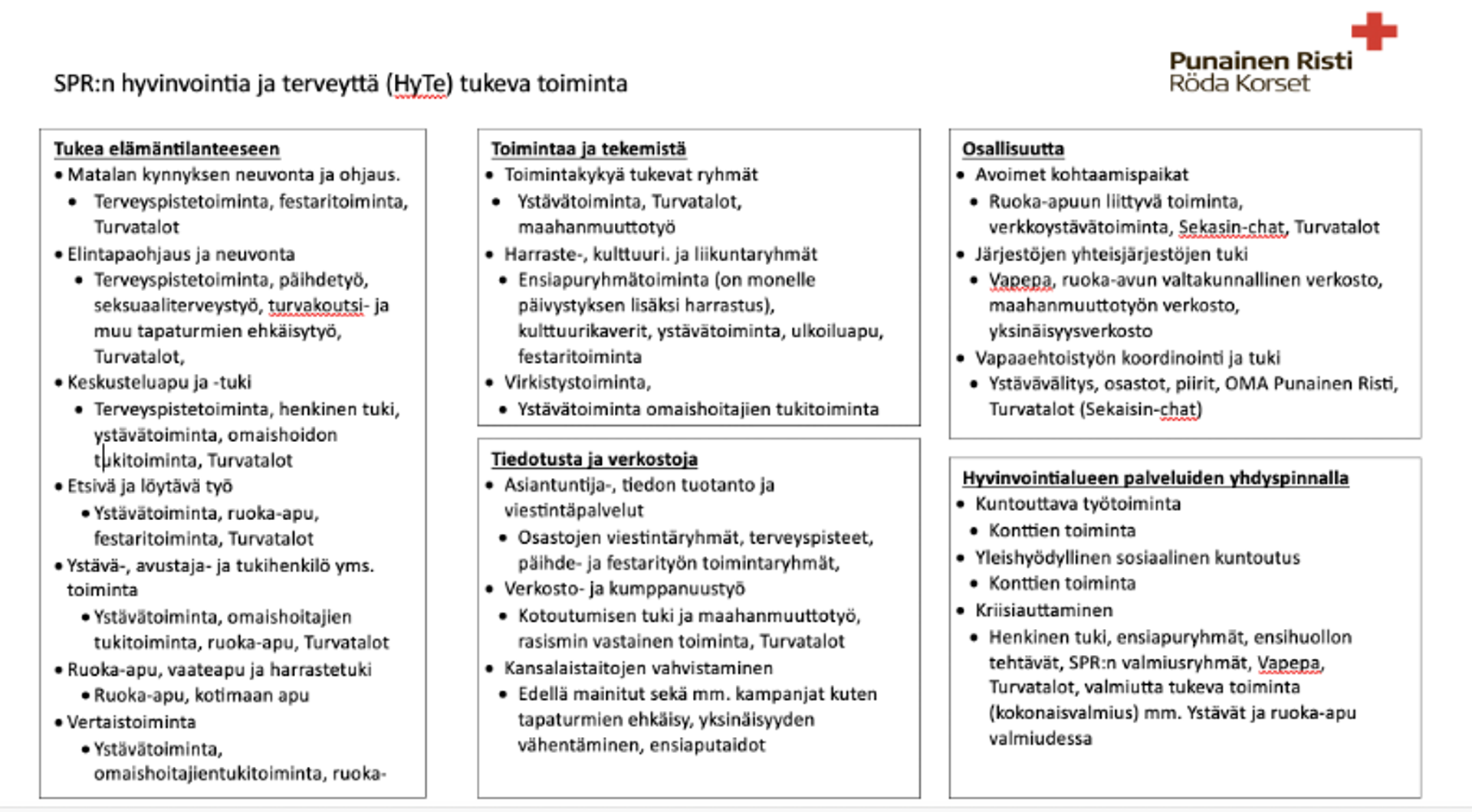 SPR:n hyvinvointia ja terveyttä edistävällä toiminnalla vahvistetaan myös ihmisten osallisuuden kokemuksia. Alla on listaus usemmista SPR:n hyvinvointia ja terveyttä edistävistä toimintamuodoista, jotka vahvistavat sekä osallisuutta, luottamusta, ihmisten sosiaalista pääomaa ja yhteisöjen resilienssiä.