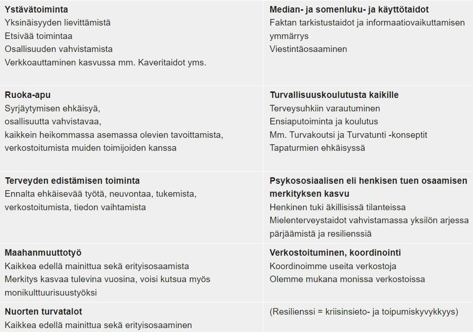 - Arjen turvallisuutta tukeviin toimintoihin (muun muassa ensiapuryhmät, tapaturmien ehkäisy, terveyden edistäminen)