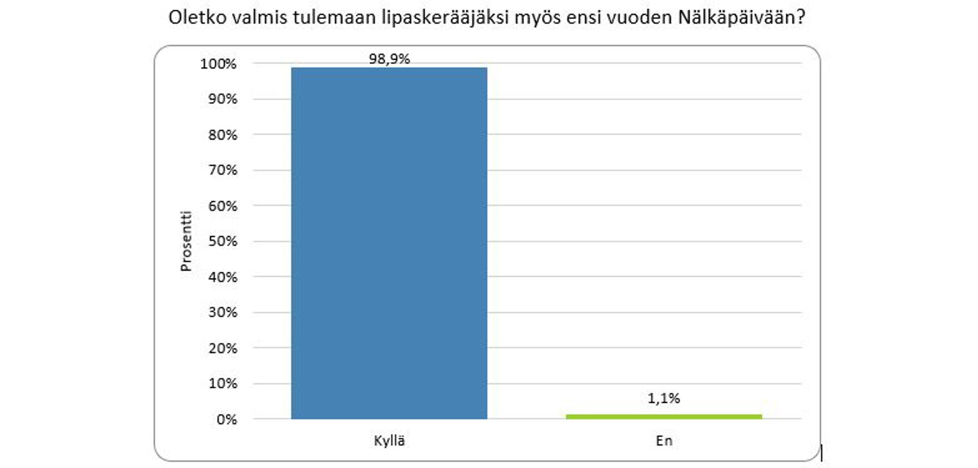 Nälkäpäivän kerääjäkyselyn mukaan lähes kaikki lipaskeräämistä kokeilleet ovat valmiita tulemaan kerääjäksi uudestaankin. Pitäkää siis huoli, että kaikki kerääjärekisteriin haluavat lisätään sinne, jotta heidät varmasti osataan kutsua mukaan uudestaan tulevinakin vuosina. Ohjeet löytyvät sivun lopputyöt osiosta.