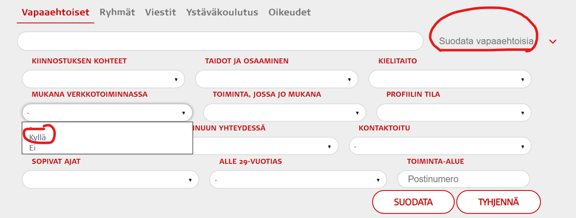 OMA Punaisessa Ristissä on mahdollista etsiä osaston tai piirin verkkovapaaehtoisia käyttämällä "suodata vapaaehtoisia" -toimintoa.